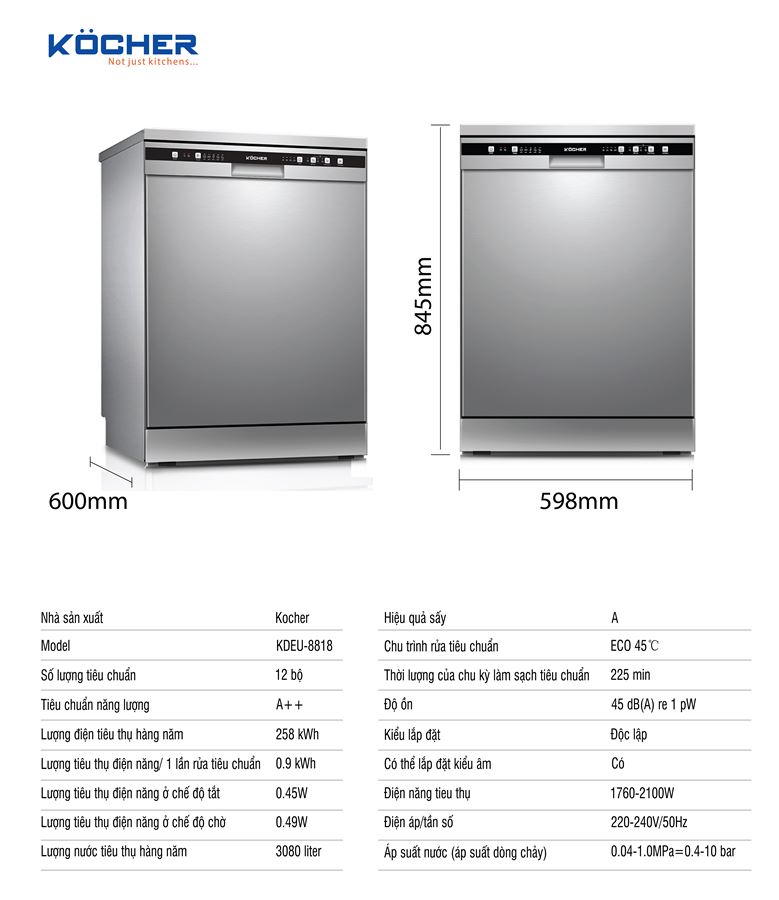 Máy rửa bát Kocher KDEU-8818 với sang trọng, hiện đại có thể lắp độc lập hoặc bán âm dễ dàng, đây là dòng máy 12 bộ với nhiều tính năng ưu việt hiện đại nhất hiện nay. Model KDEU-8818 chắc chắn sẽ mang lại nhiều lợi ích cho người tiêu dùng.