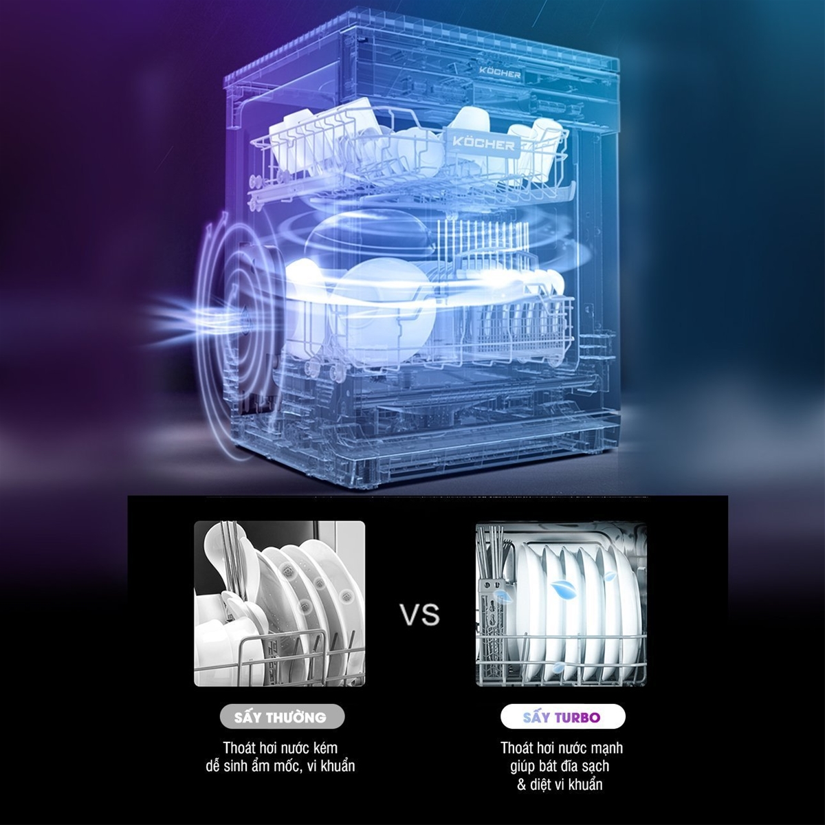 Công nghệ Turbo là công nghệ sẽ giúp thúc đẩy khả năng bay hơi và tăng cường độ bóng bề mặt xoong nồi, bát đĩa giúp cho bát đĩa khô nhanh hơn.