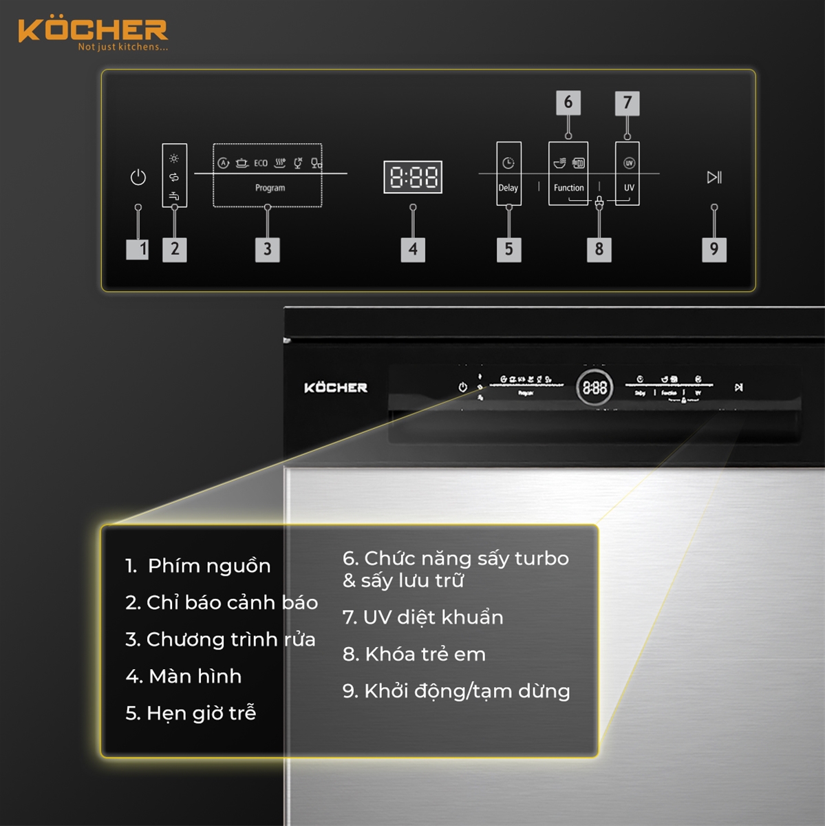 Máy rửa bát Kocher KDEU-8828 Semi được tích hợp 6 chương trình rửa bao gồm rửa Auto, rửa chuyên sâu, rửa Eco, rửa diệt khuẩn, rửa ly, rửa nhanh cùng với các tính năng thông minh như: Chức năng sấy khô 3D tăng gấp 2 hiệu quả cho máy, chức năng sấy lưu trữ 24/72h, có chế độ tia UV diệt khuẩn, khóa an toàn trẻ em, hẹn giờ rửa thông minh.