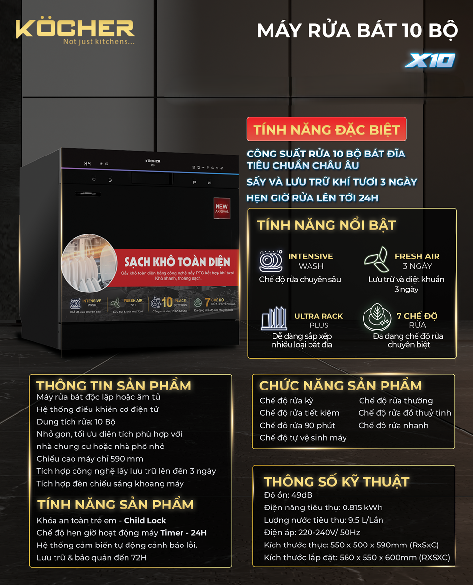 Máy rửa bát Köcher X10 có thông số kỹ thuật tối ưu, phù hợp với nhu cầu sử dụng của các gia đình trẻ:
