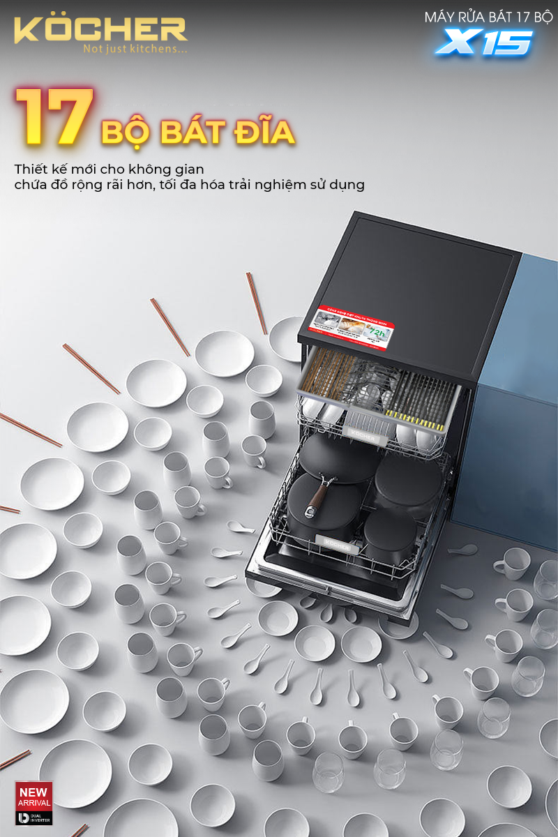 Với Máy rửa bát Kocher X Series, bạn sẽ trải nghiệm công nghệ tiên tiến với dung tích rửa lên đến 17 bộ bát đĩa, kèm theo những tính năng nổi bật như sấy khô Extra Plus Drying, khu vực nan xếp bát thông minh, và