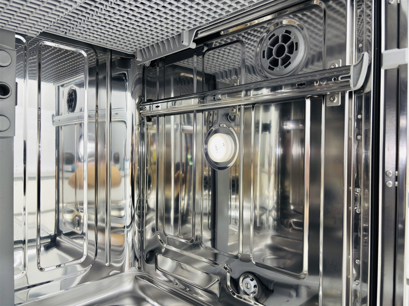 Khoang rửa của máy được chế tạo từ Inox 304 và Inox 430 cao cấp, nổi bật với khả năng chống gỉ sét, chống ăn mòn vượt trội, đảm bảo độ bền bỉ theo thời gian. Chất liệu cánh cửa bằng thép tấm SPCC và khu vực điều khiển bằng mặt kính đen không chỉ mang lại vẻ ngoài sang trọng mà còn dễ dàng vệ sinh, giữ cho bếp luôn sáng bóng như mới.