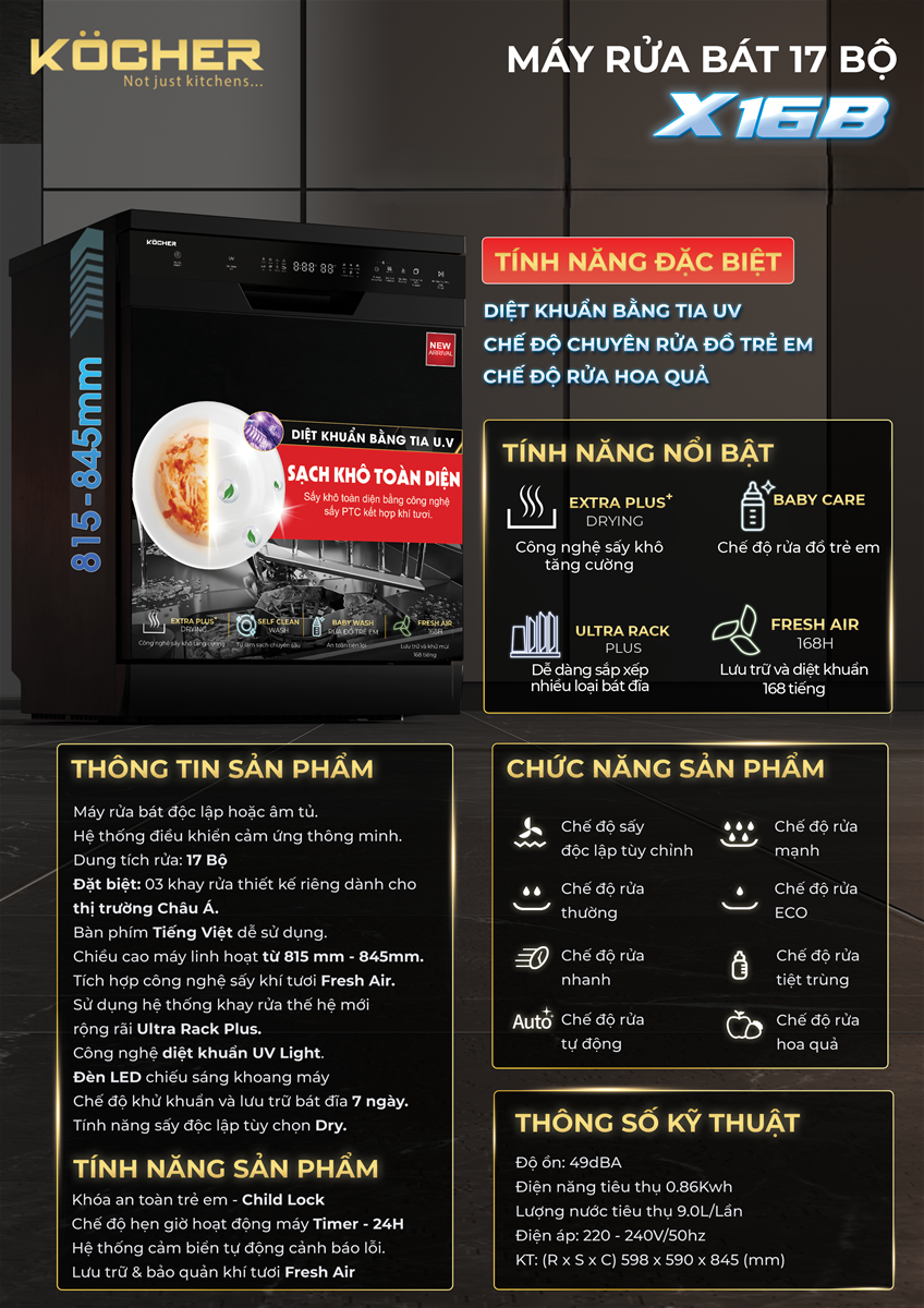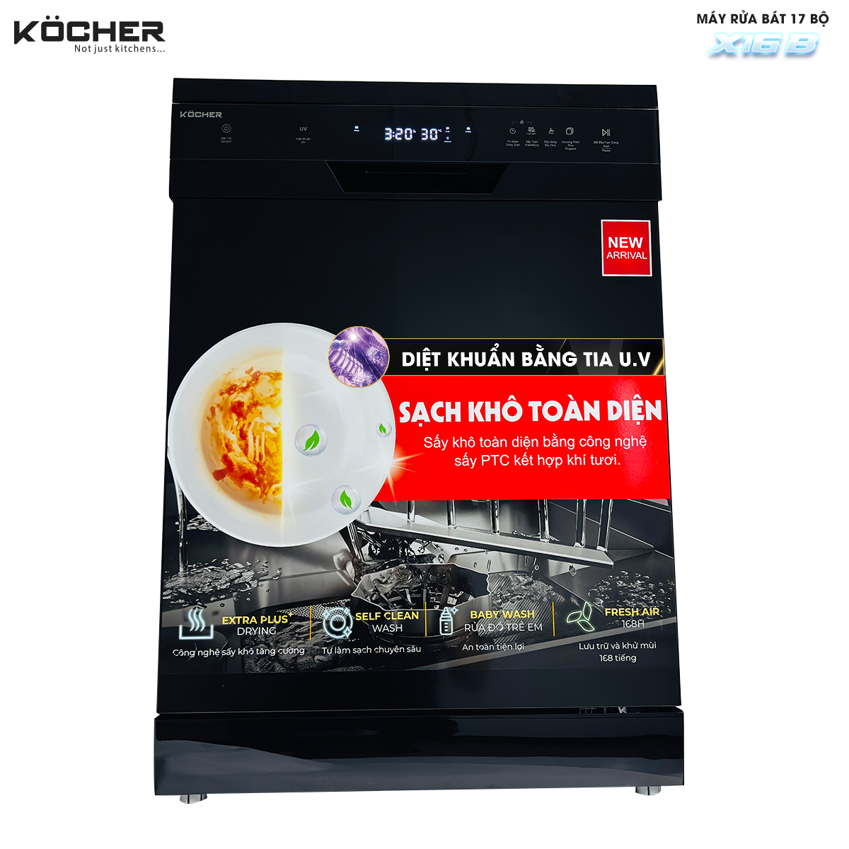 Máy rửa bát Köcher X16B không chỉ là một thiết bị, mà là giải pháp toàn diện cho gia đình hiện đại, kiến tạo không gian bếp tiện nghi, an toàn và sạch sẽ. Với khả năng "3 trong 1" vượt trội: rửa sạch mạnh mẽ, sấy khô hoàn hảo với tính năng sấy độc lập, và tiệt trùng chuyên sâu bằng UV Light (đặc biệt cho đồ dùng trẻ nhỏ), cùng khả năng lưu trữ 7 ngày không ẩm mốc, X16B chính là chiếc máy rửa bát cao cấp mang đến sự tiện lợi tối đa, tiết kiệm thời gian và sự an tâm tuyệt đối cho tổ ấm của bạn.