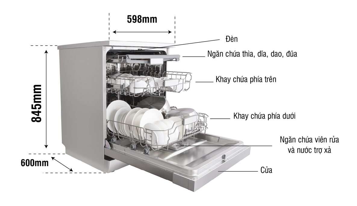 Máy có 2 ngăn rửa: Ngăn trên xếp được 20 chén bát, ngăn dưới xếp được 3,4 xoong nồi cỡ nhỏ và vừa.