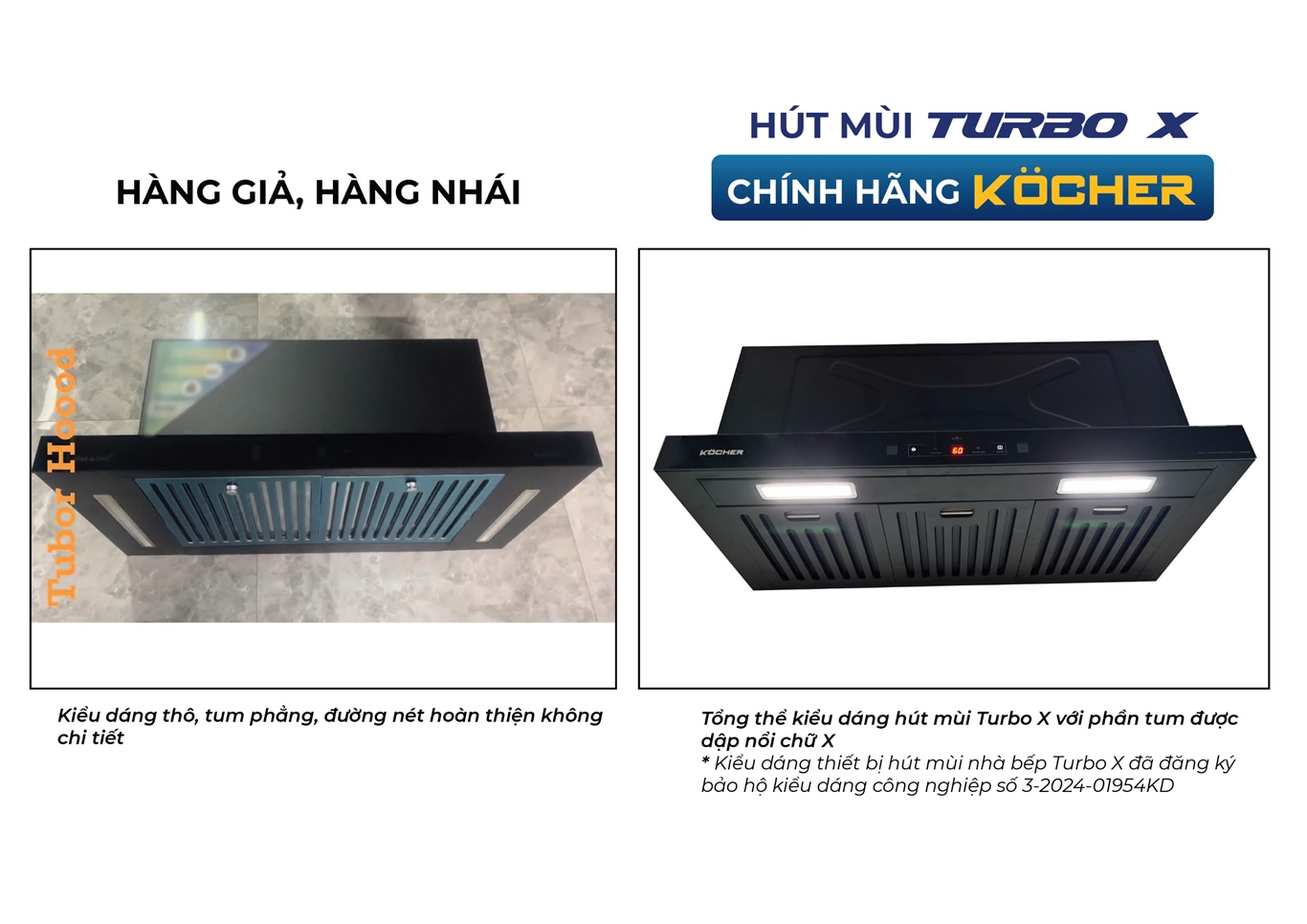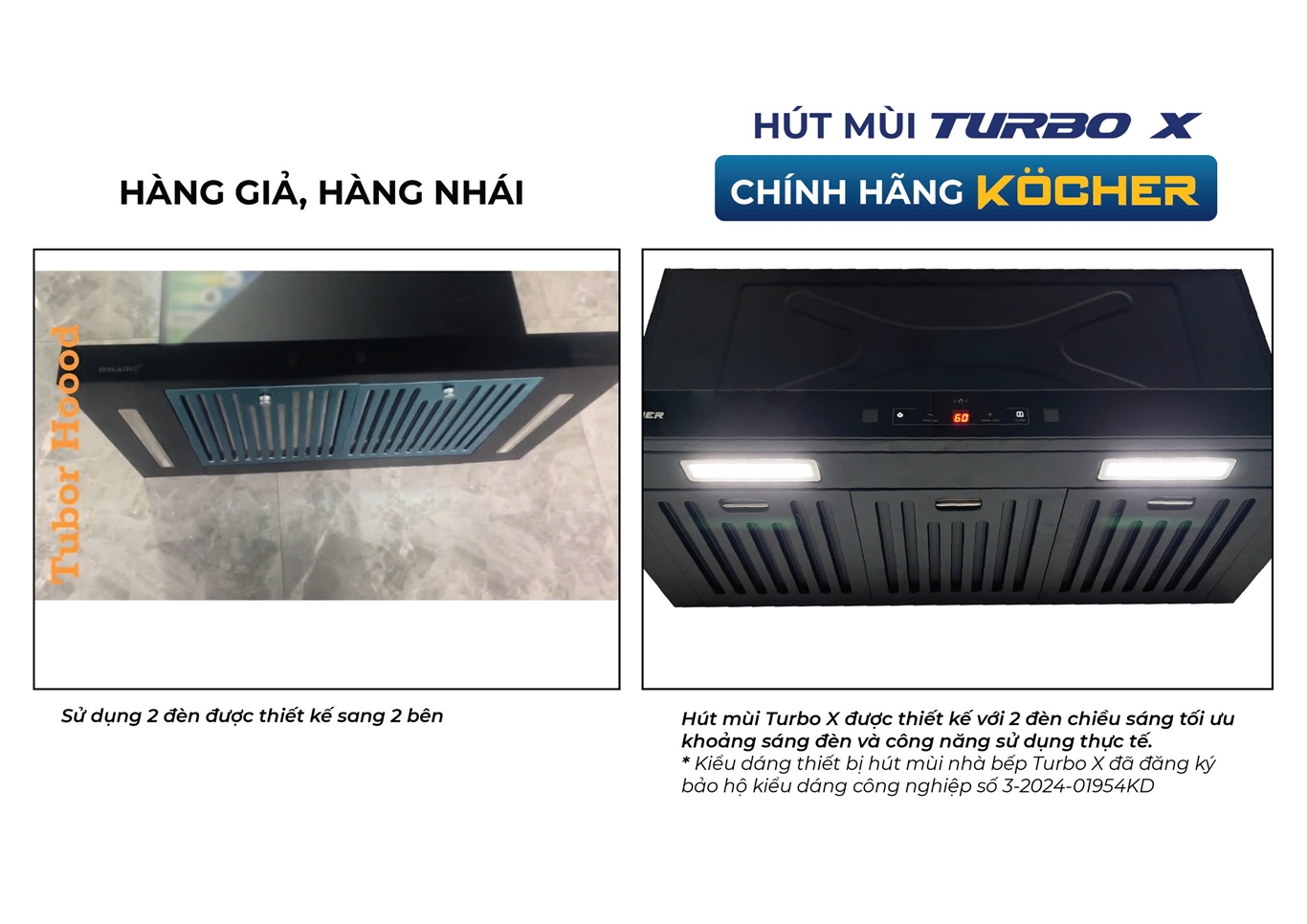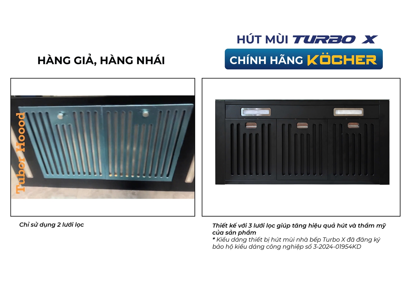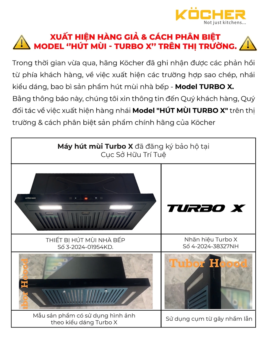 Trong thời gian vừa qua, hãng Köcher đã ghi nhận được các phản hồi từ phía khách hàng, về việc xuất hiện các trường hợp sao chép, nhái kiểu dáng, bao bì sản phẩm hút mùi nhà bếp - TURBO X. Bằng thông báo này, chúng tôi xin thông tin đến Quý khách hàng, Quý đối tác về việc xuất hiện hàng nhái HÚT MÙI TURBO X trên thị trường & cách phân biệt sản phẩm chính hãng của Köcher.