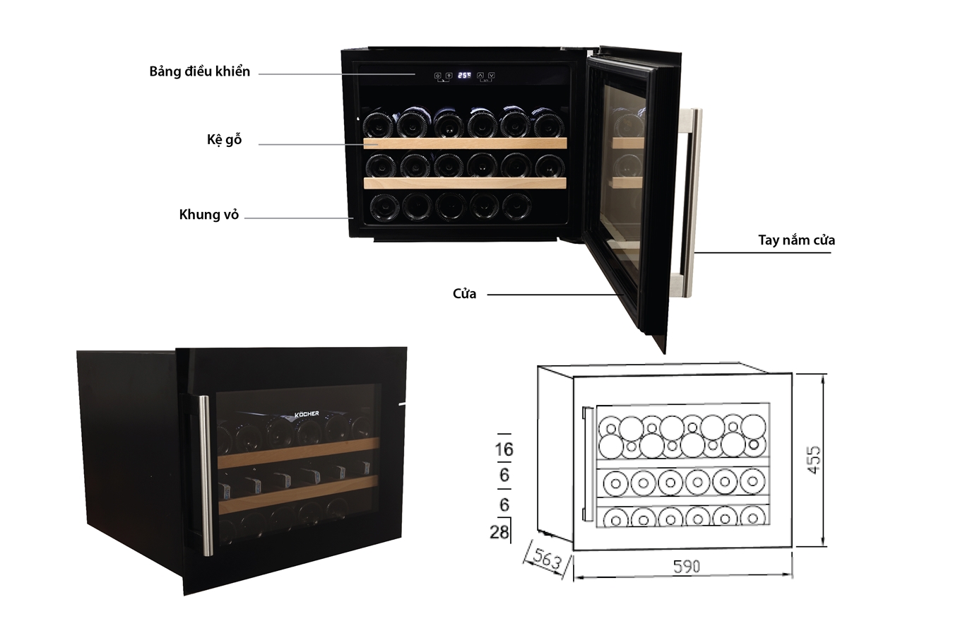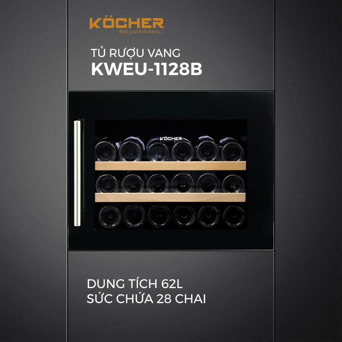 Tủ rượu chất lượng cao với công nghệ máy nén, lưu trữ 28 chai (tiêu chuẩn Bordeaux 750ml).